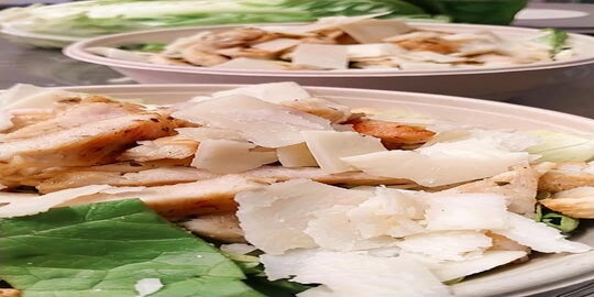 Lattuga Romana, Pollo grigliato, pancetta affumicata, crostini, formaggio parmigiano e salsa caesar.