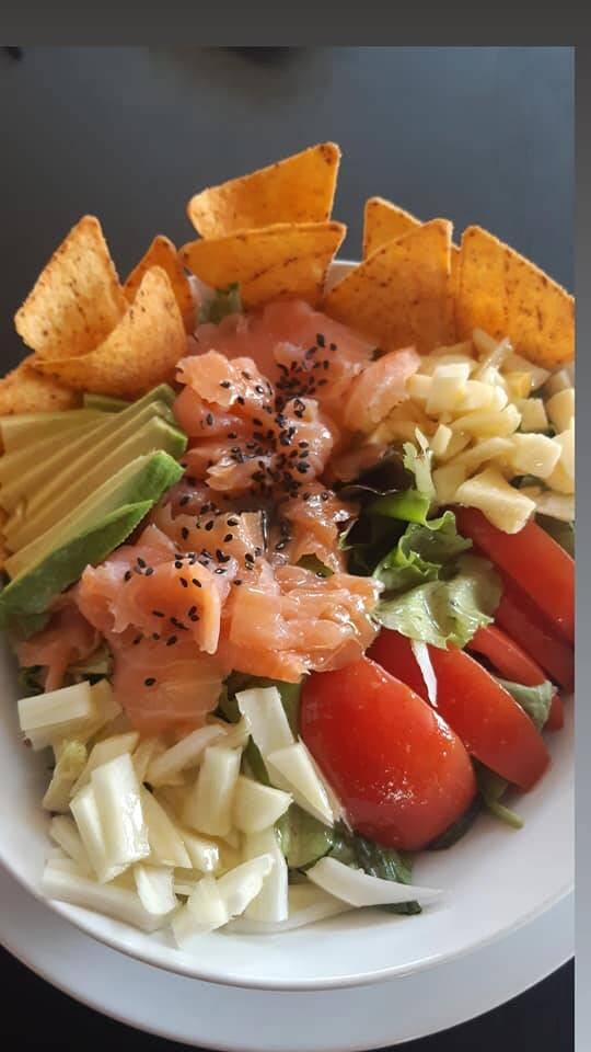 Mix Insalata, Salmone affumicato, avocado, pomodori, cipolla agrodolce, mele, sesamo, finocchio, nachos e codimento.