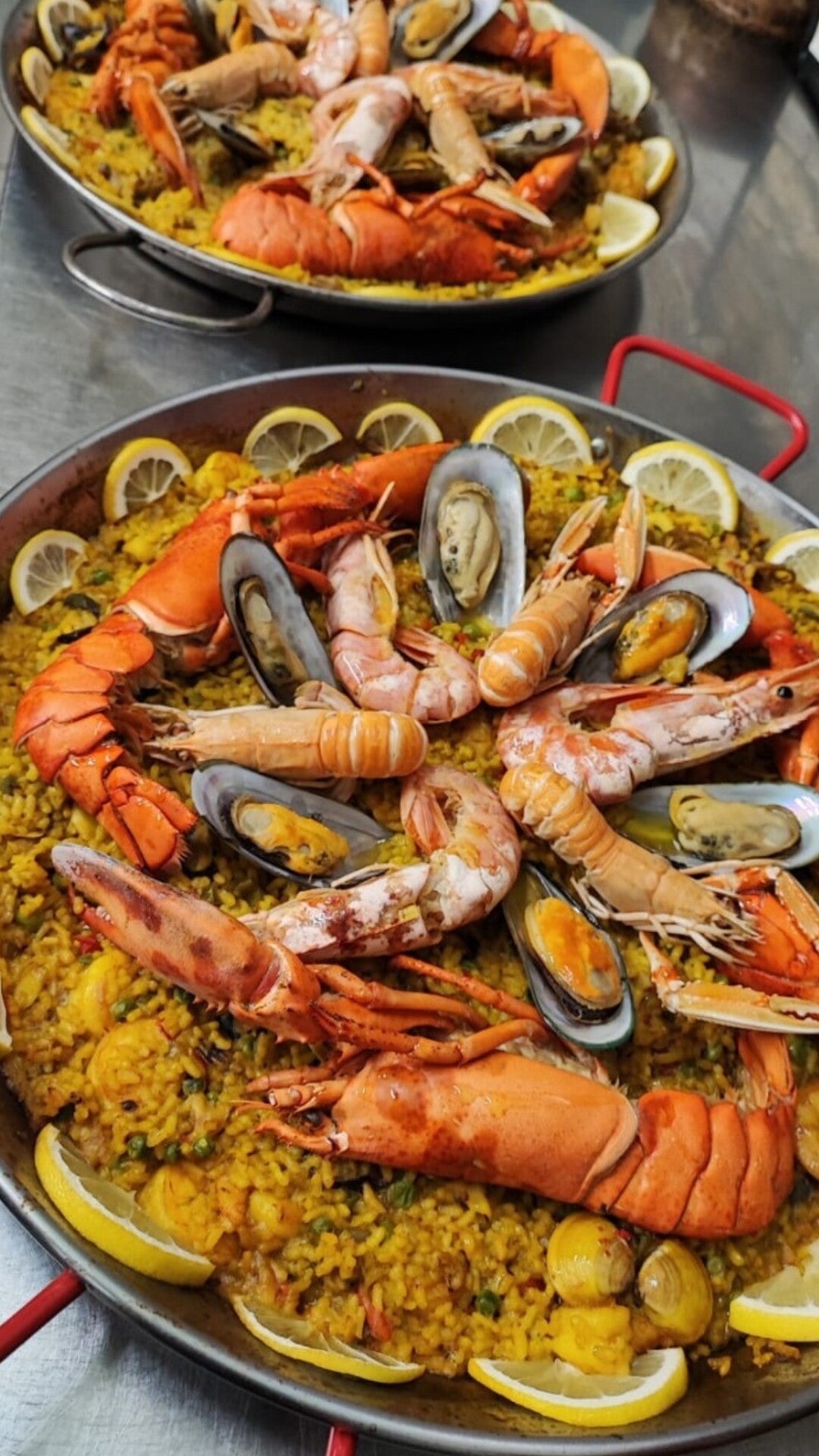 Un piatto emblematico della cucina spagnola, la paella e una sinfonia di sapori e profumi mediterranei. Preparata con risso a chicco corto (Arroz Bomba) portato direttamente di Valenzia, cotta lentamente en un ampio tegame.